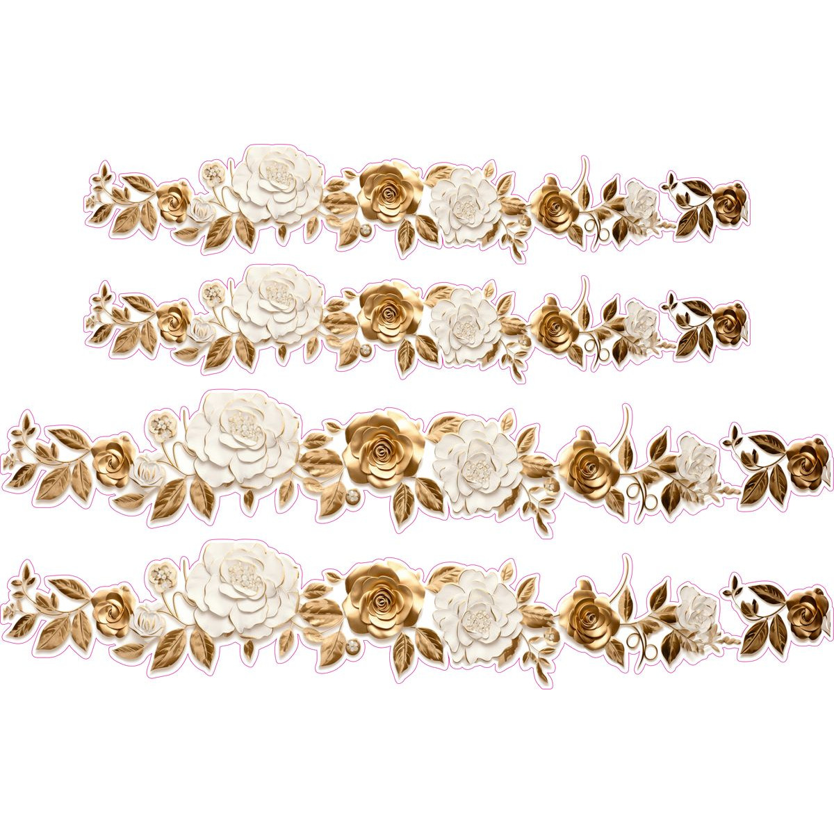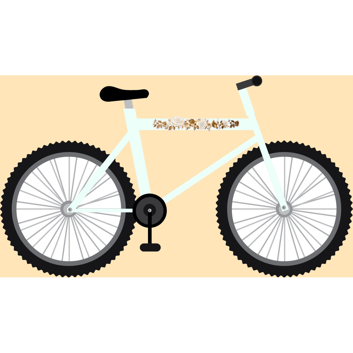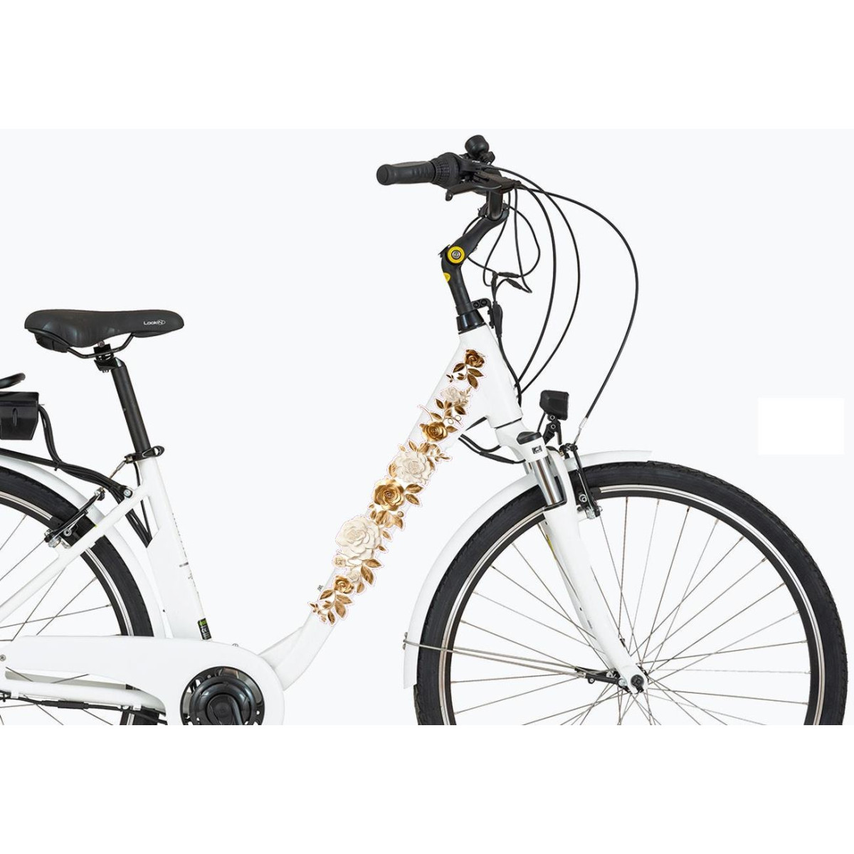 Arany színű metál hatású fehér rózsás virágos bicikli matrica, női és gyerek virág mintás kerékpár matrica