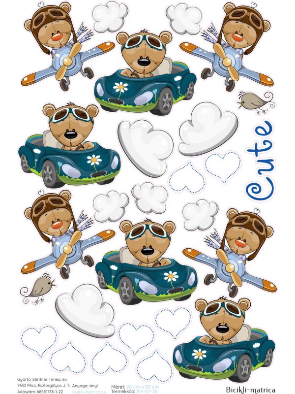 Macis gyerek bicikli matrica szett, felhő, szív, madár, maci repülőt vezet, maci autózik kisfiú kerékpár matrica