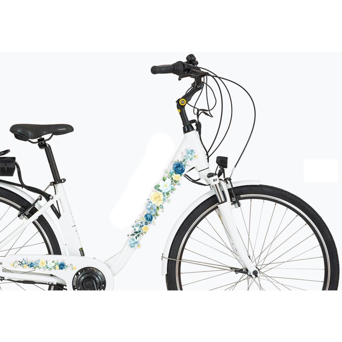 Gyönyörű pasztell világoskék és sárga rózsás, virágos bicikli matrica, női és gyerek virág mintás kerékpár matrica